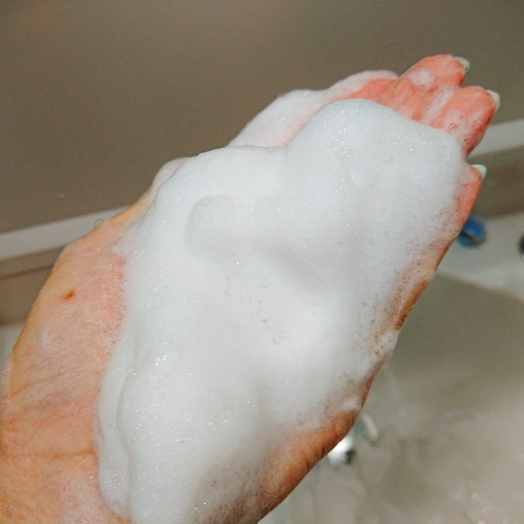 像這樣將手掌中的酵素潔膚粉搓揉出很多泡沫。有些人因為「懶得打出泡沫」就在水多過於泡沫的狀態下洗臉。非常不推薦這樣的使用方,除了會直接摩擦肌膚之外,也無法充分發揮潔膚粉的效果。能夠搓揉出一大團泡沫的重點就是「加水量」。如果一次加太多水會沖掉酵素潔膚粉,必須保持「黏糊」狀態慢慢加水以搓揉出泡沫。酵素潔膚粉跟一般的洗面乳不同較難起泡,所以必須耐心充分搓揉出泡沫才行。請努力像照片一樣搓揉出裝滿手掌心的泡沫,目標就是手掌朝下泡沫也不會流下來的濃稠泡沫。如果使用起泡網,可以更快搓揉出泡沫。