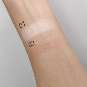 色號01香檳金,顏色不僅適合我們亞洲人偏黃的暖色肌調,妝感效果也很像專櫃牌Dior的某一款打亮品。只要在C字部位、山根、額頭等輕輕一刷,臉部瞬間變得超立體,難怪在日本妹子們之間颳起了一股搶購風潮。