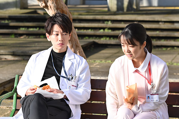 在本集最後,在與院內上司、同事聚餐完回家的路上,天堂浬和喝醉的七瀨一起坐在公園長椅上休息。
