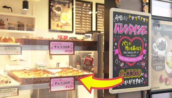 之後鏡頭帶到天堂浬買麵包的店家門口,宣傳的黑板上寫著「今天是情人節!要不要用巧克力螺旋麵包來傳達愛意啊」的宣傳文字。
