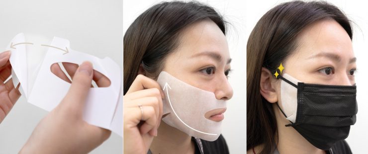撕開防護膜,沿著下巴往上緊密貼合,再載上一般口罩即可