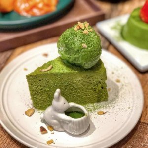 抹茶重乳酪蛋糕真的是抹茶味超級重!濃郁抹茶乳酪的上面放著他們店家自製的抹茶冰淇淋,還附上抹茶淋醬,整個就是超級抹茶味。