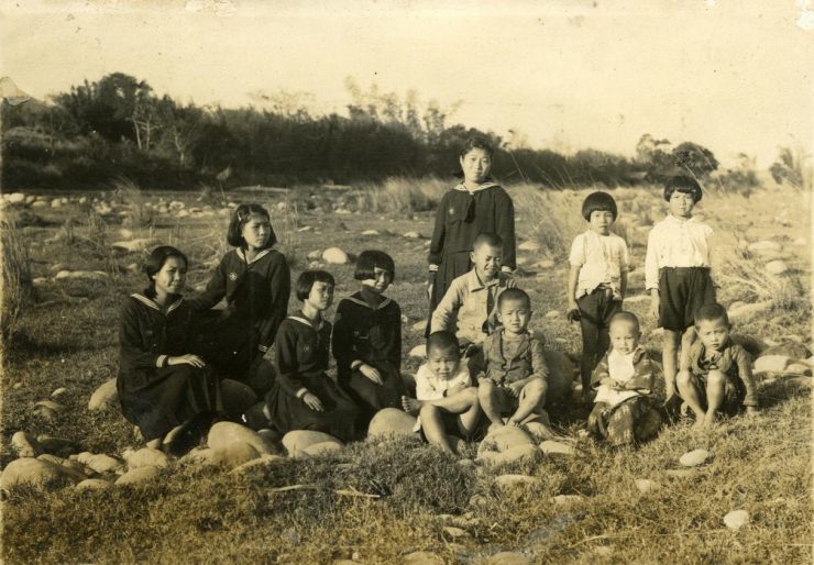 日治時期在苗栗中港溪合影的女學生與小孩。Source:意象.台灣影像資料庫