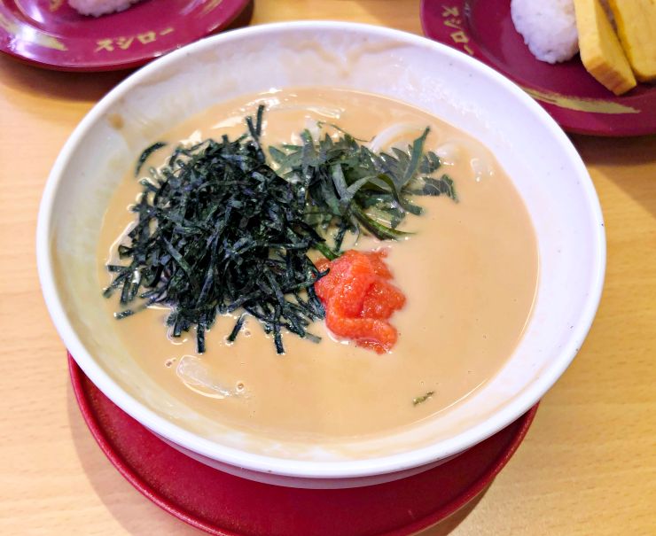 這次點的烏龍麵口味是新品,上層滿滿的明太子、海苔以及紫蘇。稍微攪拌一下就可以吃,壽司郎的烏龍麵不軟爛且非常有嚼勁,湯有濃濃的奶油味,若只搭配上明太子,可能吃兩口就會覺得非常膩,但因為他有加了紫蘇和海苔,可以中和掉奶味和明太子的鹹味,這個搭配真的有驚豔到小編,喜歡烏龍麵的一定要點。