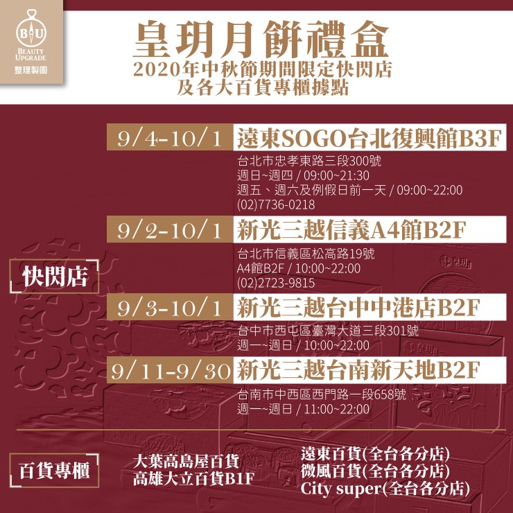 目前實體門市都只有在香港才有據點,但現在因為疫情的關係,也不方便前往。不過沒關係,先別急著敲碗,因為皇玥知道在台灣也有很多人期待今年也可以吃到他們家的月餅,所以已經決定這次也會在台灣推出期間限定店及專櫃販賣唷!