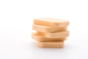 關於材質,多數的海綿使用天然橡膠(乳膠)和聚胺酯,但是因為有對乳膠過敏的人,所以使用聚胺酯比較安心。
