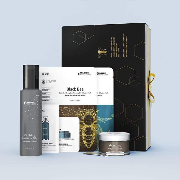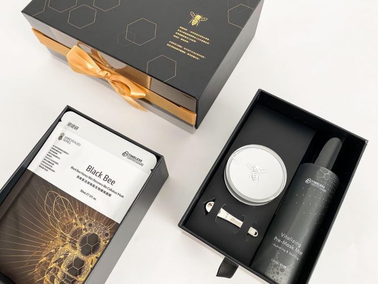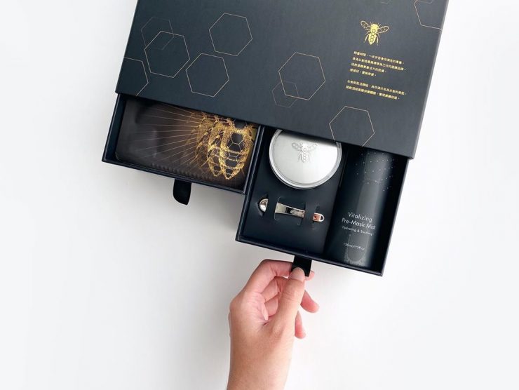 典雅黑色霧面精裝盒上,燙印著細緻的金色蜂巢與瑞士黑蜂,並繫上絲絨感的金色緞帶;禮盒內有左右兩個抽屜,分別放置上述四項商品,不只方便收納,開啟抽屜時也伴隨著驚喜與幸福感,非常適合送禮及收藏;而針對自用或喜歡簡約包裝的消費者,提提研亦推出無禮盒版的「永衡新肌活顏組」,無論選擇哪一種都能享受最完整的頂級面膜保養體驗。