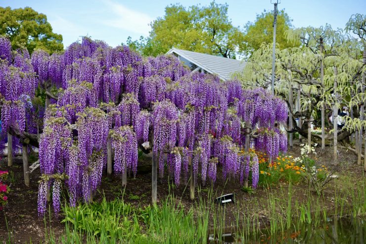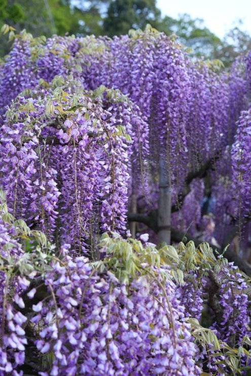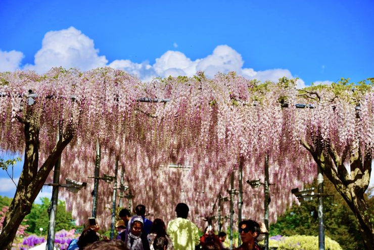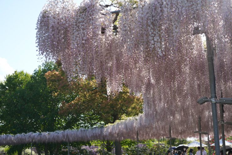 藤公園以「藤花品種位居日本之冠」聞名,在紫藤花祭中可以看到超過100種品種的紫藤花,而且全都分布在500公尺長的藤花棚架上,站在棚架下有種被紫藤花包圍的神秘感受,同樣是非常經典的紫藤花美景。