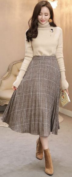 如果你是梨型身材女孩,上身可以搭配貼身素面的針織毛衣,與下半身格子圓裙的花色做出對比,達到上半身更顯瘦的效果。再利用高腰的裙子更加強調腰部線條~下半身的臀部較豐腴的緣故,可以選擇裙擺較大的面積來蓋住下半身。