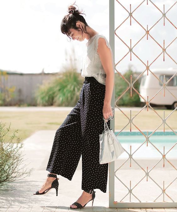 輕薄的點點織衫加上寬褲穿搭。寬褲既可以休閒也可以正式,是萬能的款式。