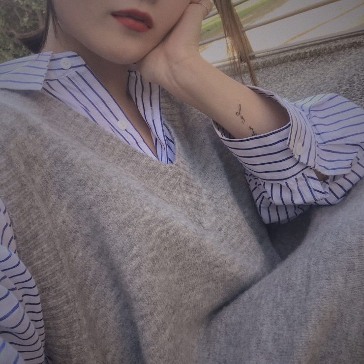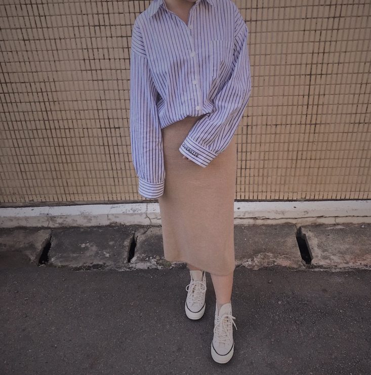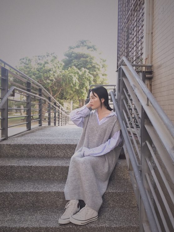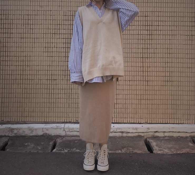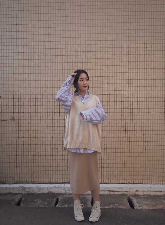 襯衫很容易第一直覺聯想到的單品,就是針織背心了,可以馬上穿出輕鬆的學生味兒,因為想要整體色調有一致,會給人比較清新的氛圍,所以下面也搭上同色調的針織窄裙,這樣穿也可以很微妙的遮肉顯瘦喔!