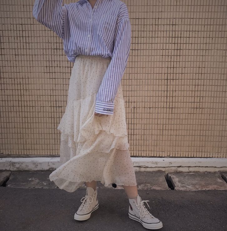 如果你想要甜甜的,就拿出你的紗裙出來搭配吧,藍白襯衫跟紗裙也是意想不到的match,會有種很輕盈的夢幻感。鞋子是奶油色的converse,讓風格不至於過女孩子氣。