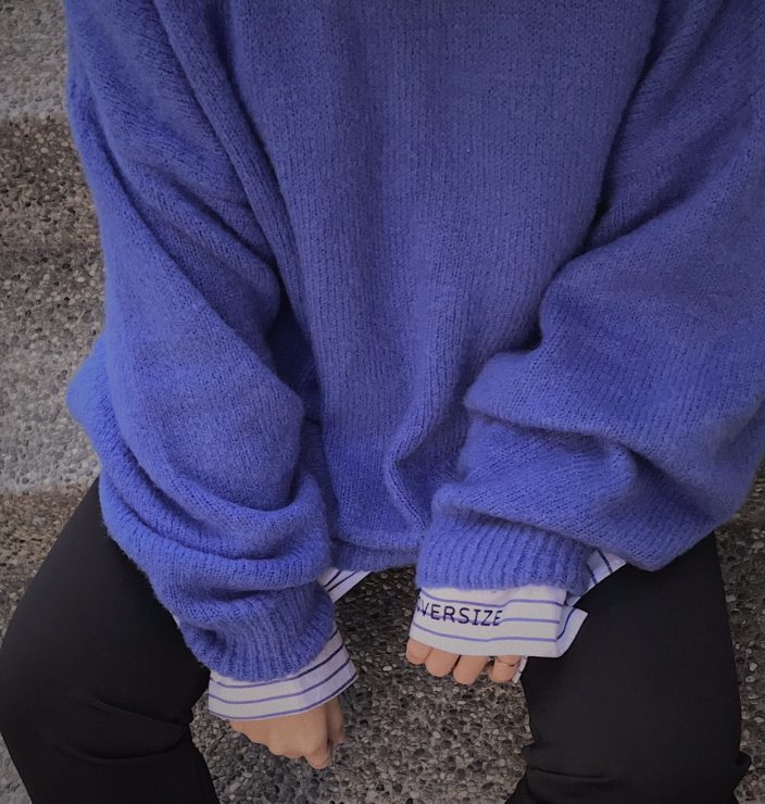 天氣冷一些時,外面直接穿一件寬鬆的毛衣吧,非常簡單好上手,也不用什麼動腦就可以完成的搭配,下面其實想搭奶油白褲或是黑褲都很OK喔!