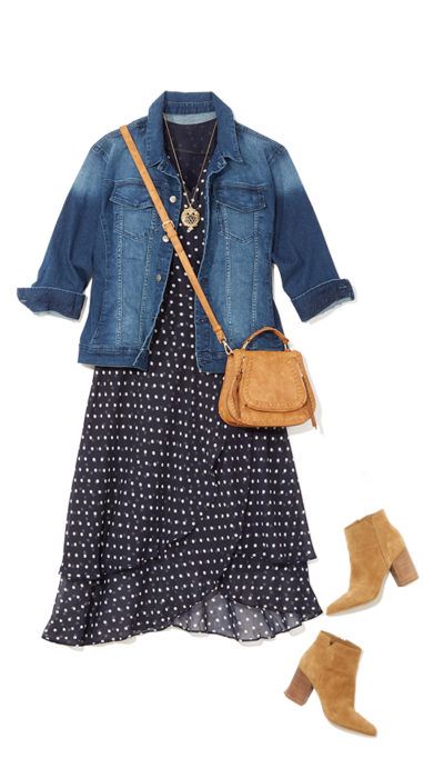 圓點洋裝也是非常適合春天的穿搭,配上短版牛仔外套可以強調腰線,細肩帶的包包斜背也有顯瘦效果,短靴則是可以拉長腿部線條。