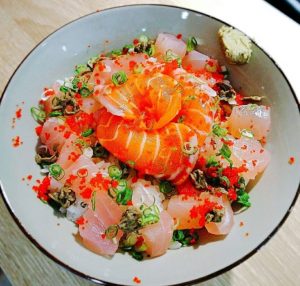 蟹膏雙拼丼的份量超級大,對於女生來說會太飽,因此若是女生吃的話可能要考慮一下份量。玫瑰鮭魚和骰子魚肉塊有稍微炙烤過,香氣十足。搭配蔥花、蟹膏以及魚卵看起來不僅畫面美觀,味道也好吃。