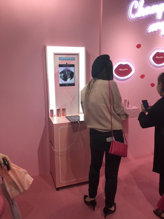 旁邊這一台機器,可以先調整自己想要的唇膏顏色後,機器就會拍下三張照片,然後可以自由加上可愛的貼圖,就大功告成!之後只要拍下機器顯示出來的QR碼,再登錄信箱就可以拿到影片了。如果不知道怎麼操作也可以問旁邊的工作人員,他們都會耐心教導。