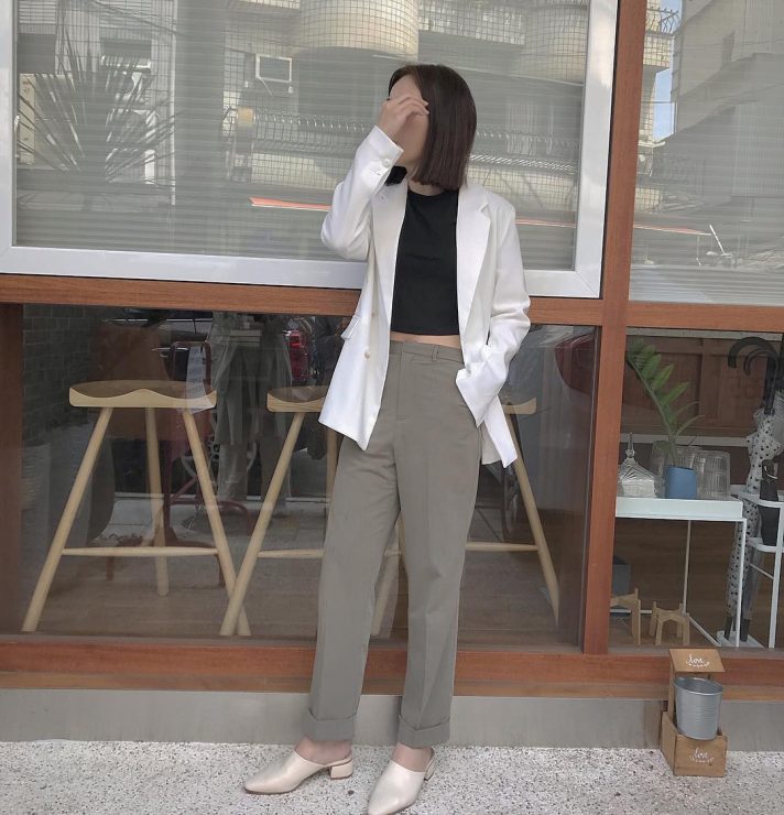 今年很流行短版的上衣,對於嬌小的女生來說特別友善,穿起來就是會顯高!外面簡單穿上白色的西裝外套,格外的俐落帥氣,整體很有套裝感!