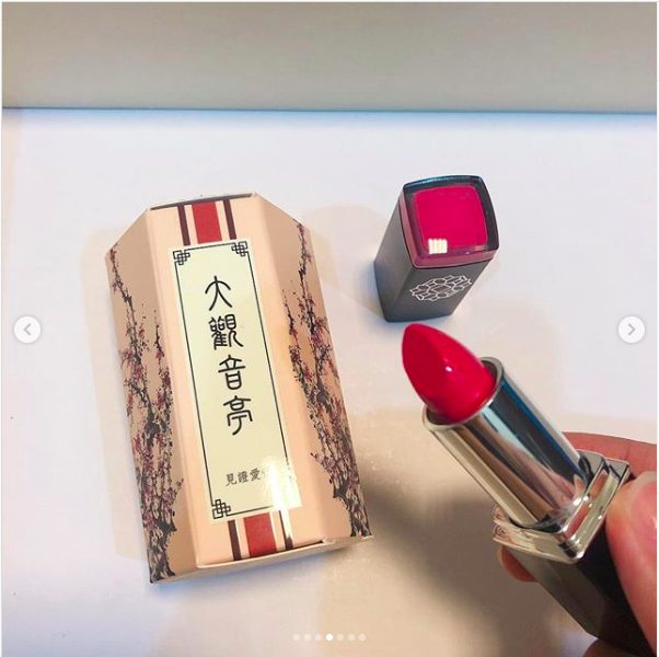 大觀音亭月老的特色是見證愛情,這位月老的嘴唇比較厚,耳朵也比較大,單戀或是感情沒著落都可以來拜。拜大觀音亭的月老時,要將自己喜歡的對象條件說清楚,請月老爺爺幫你安排,大觀音月老掌說媒,所以口紅顏色以諧音「莓」為主的莓果色。雖說是莓果色,但沒有帶過多的紫色調,所以不會太過銳利難以親近,更顯得活潑,適合不敢擦大紅唇的女孩們,外包裝是黃底搭配梅花圖案(請往右點選看試色)。