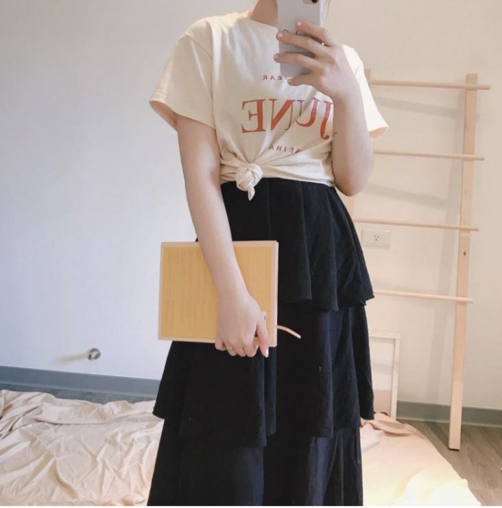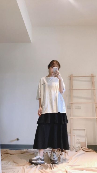 最近很流行T恤側綁結,可以營造一種隨性的休閒感,有些人還會利用這樣的方式,露出一小截肚子肌膚,看起來還有點迷人的性感。我的蛋糕裙是整件式的洋裝,不過其實拿來單純當下身也是可以的,就把T恤罩在外,在差不多腰最細的位置綁一個結就完成了,看起來也是休閒又可愛,還會有顯瘦感喔,再踩雙老爹鞋就又更完美。