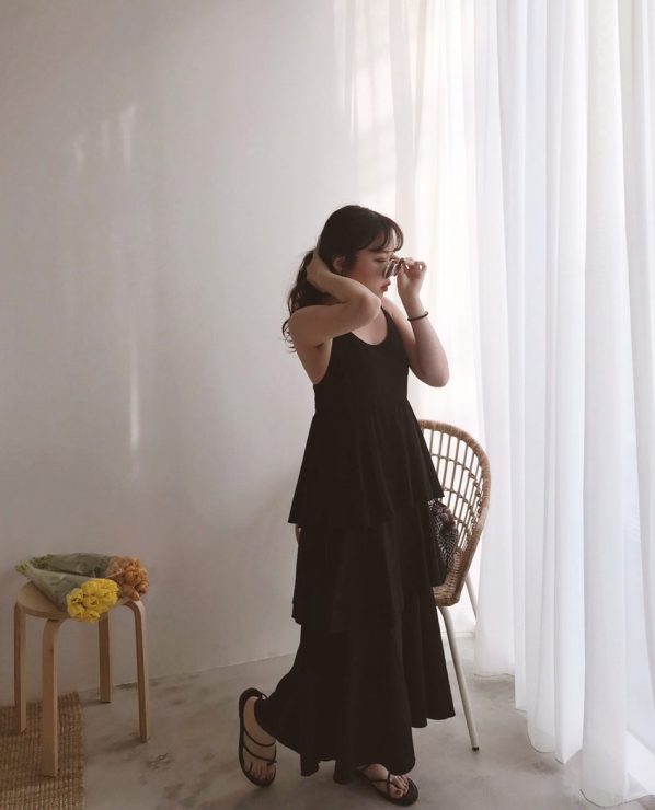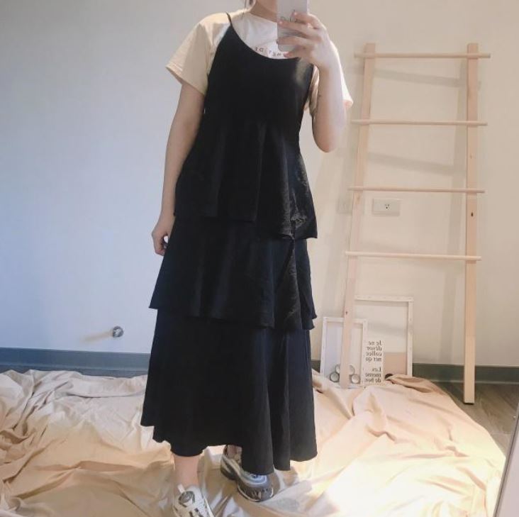 很多人喜歡的韓風穿搭,會在像這樣的細肩帶洋裝裡,內搭上T恤,一般直筒或是沒有像蛋糕裙澎感這麼重的版型,這樣搭都很安全絕對過關,但蛋糕裙千萬不要這樣試,因為一旦這樣穿,把顯瘦的鎖骨都遮了起來,反而更顯虎背感,加上很有份量的單品,整個人又更「熊」了…所以說~自認不是紙片人的話,千萬別自曝其短呀!