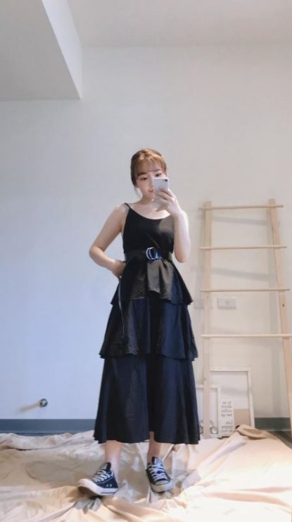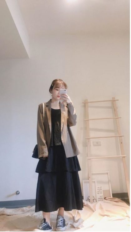 這招就是直接讓你混淆視覺,看不到身材(笑)。因為蛋糕裙是下半身澎澎的,所以如果你上身搭一件寬鬆oversize的單品,就可以看起來好像整件寬寬的,又變身出另一款新洋裝的感覺,因為我是黑色款,所以看起來還會有點帥帥的喔,對了,蛋糕裙的長度,最好選擇在腳踝以上喔,這樣一來即使全身寬鬆,也會看起來瘦喔。