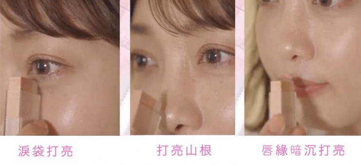 - 若在山根至鼻尖處打亮則能使鼻樑立即變得高挺立體,若是想要畫出輪廓分明的混血妝感也可以用這款來打亮。