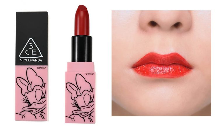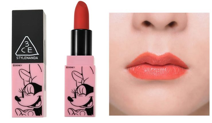 首先要介紹的是主打質感光澤的唇膏款,從3CE的高人氣明星商品唇膏色之中推出了兩個色號,第一個是米妮款 #221 粉紅。雖然寫著粉紅色但其實是帶點橘粉的甜美色,在日常中淡淡的塗一下就能捎來青春活潑的氣息妝感。