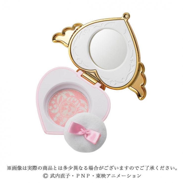 外殼就如同動漫裡美少女戰士變身使用的道具一樣,粉紅色的愛心形狀外殼,配上兩邊的金色翅膀,繫上緞帶還可以配帶在胸前,彷彿真的化身成為美少女戰士們的一員,要跟著夥伴一起出去打擊犯罪,腮紅是以粉色和白色交織,刻意臨摹動漫中變身道具的模樣,柔軟的粉撲上,還有一個可愛的蝴蝶結,整體讓人看了少女心大爆炸。腮紅刷色起來,有少女感的粉嫩,刷一筆就能呈現自然的妝效,再次加重則可已有日系甜美女孩的妝感。