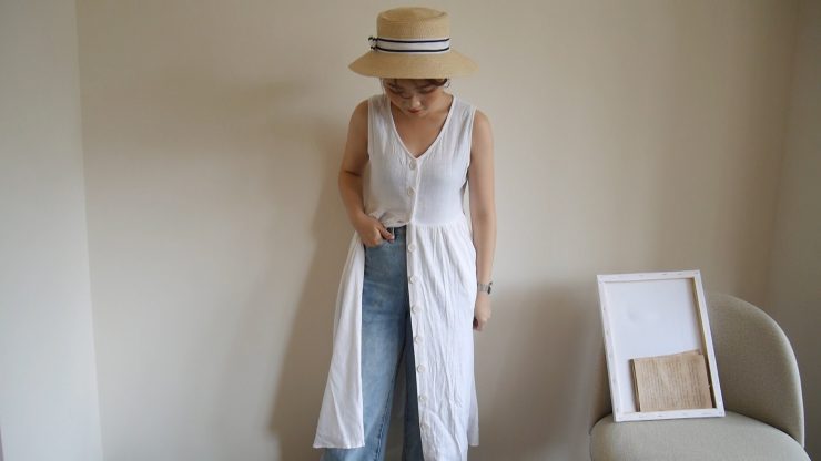 最近很流行長版洋裝下搭牛仔褲這樣隨性,又有點慵懶得搭配,不過不是每個長版T都很適合,要選擇有「開衩」設計的,才會有種率性感,也可以視覺延伸腿長,不然反而會壓垮比例。像我這件是白色背心裙,不過它中間有排釦設計,所以把下方幾顆釦子打開,就可以有開衩的效果。再配上漁夫帽,整個夏日氣息濃厚,穿起來也很舒心消暑~