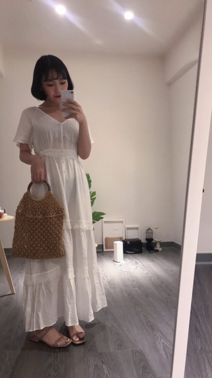 比較仙女級的長版流蘇洋裝,就直接選擇淑女一點的單品吧,我會搭上編織包、二字涼鞋,整個看起來有種像是去馬爾地夫度假的氛圍。建議大家全身色系不要太多,像我鞋子就選擇白色,只有包包顏色不一樣,這樣會比較能保留簡約的仙氣感喔!