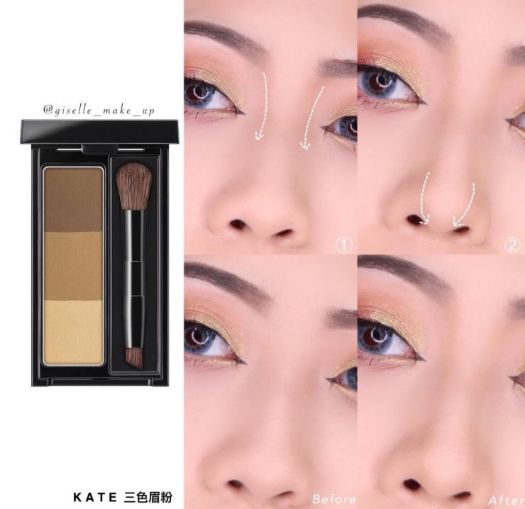 - 混合最淺和中間色的眉粉上在眉頭順到鼻樑兩側,少量多次,眉頭到眼窩處也可以多上幾次,增加深邃感