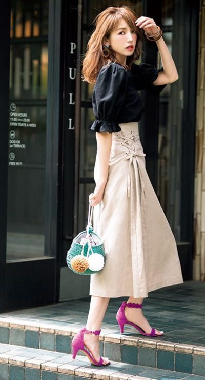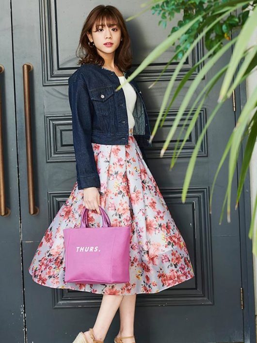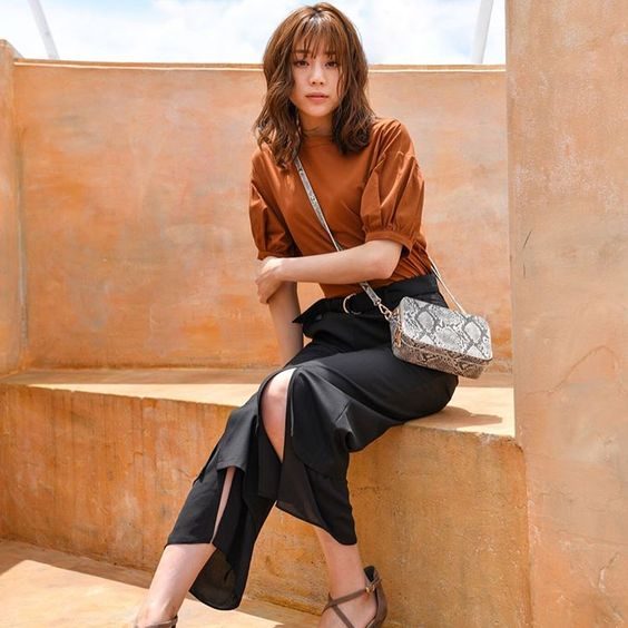 簡單的黑色針織上衣收進花裙的穿搭感很棒。再加上棕色提包,更加提升女人味。