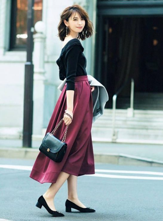 同顏色的襯衫與白色裙子,加上輕柔的深紅磚色羊毛外衣,就完成了秋季穿搭!裙子或鞋子上增添白色或米色等鮮明的顏色,就能達到極佳的平衡。