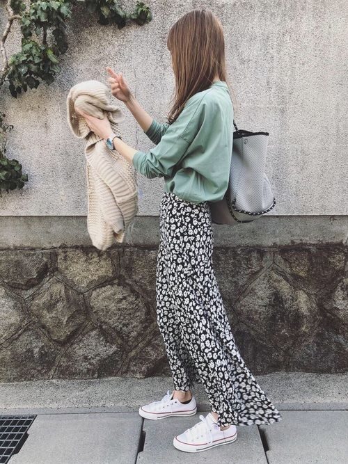 簡單的綠色針織衣搭配黑色的碎花長裙和大手提包,這樣甜美的穿搭如何?手拿米色羊毛外衣也能安心禦寒呢!
