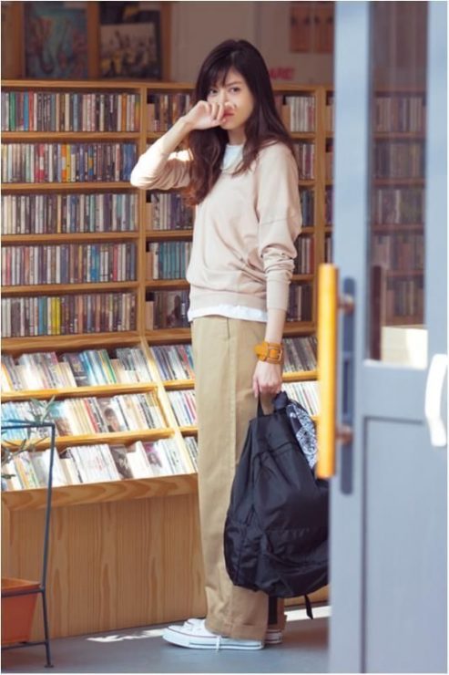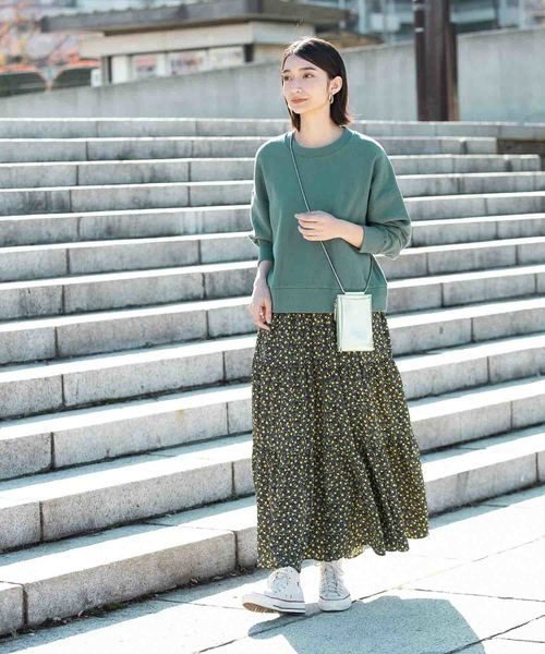 暗綠色針織的羊毛衫搭配可愛的米色百褶裙,完成了輕鬆舒適的穿搭。暗綠色×米色會帶有青春洋溢感唷。