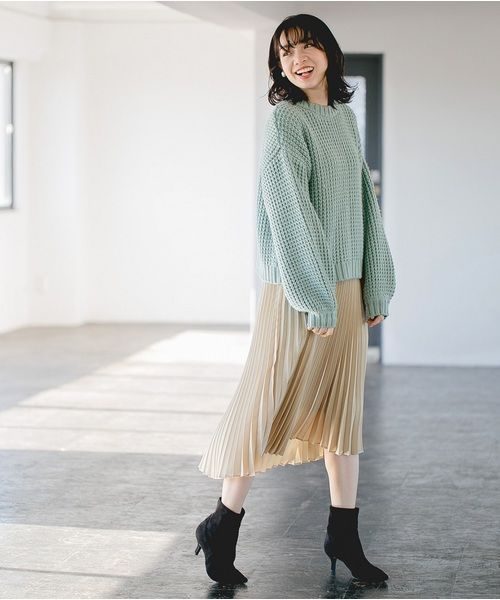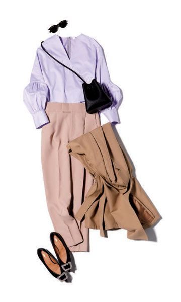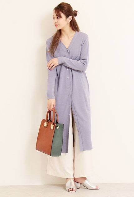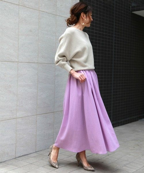 有絕妙透感的米色針織衣,搭配輕柔感的紫色荷葉裙。雖然紫色引人矚目,但與肌膚協調的米色讓整體感達到平衡,所以可以安心。