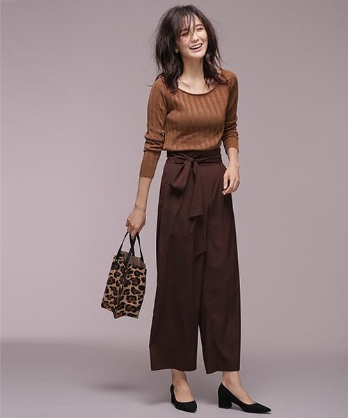 棕色的針織衣搭配附有腰帶、不同色調的棕色寬褲,就完成了棕色調的穿搭。